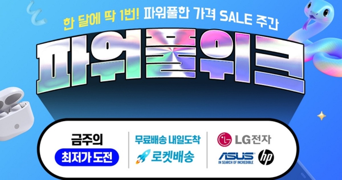 이번 달 행사에서는 2025년 푸른 뱀의 해를 맞이해 노트북, 체중계 등 시즈널한 디지털 상품을 비롯해 얼리버드 설 선물로 적합한 아이템들을 중심으로 준비했다. 기획전에 참가하는 대표 브랜드는 LG전자, 에이수스, HP 등이다.