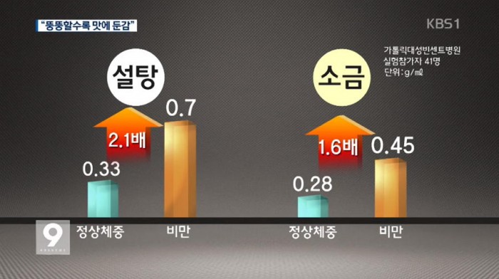 가톨릭대 성빈세트병원 실험결과에 따르면 뚱뚱한 사람이 같은 맛을 느끼기 위해선 설탕은 2.1배, 소금은 1.6배 필요한 것으로 파악됐다.