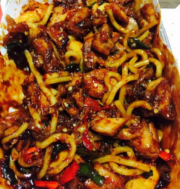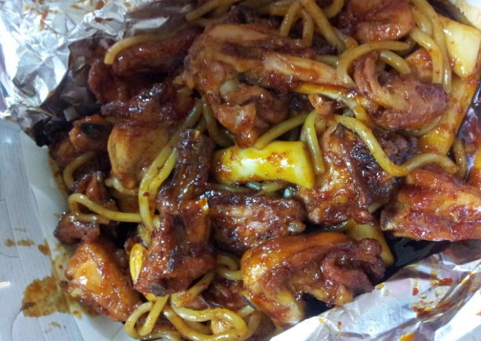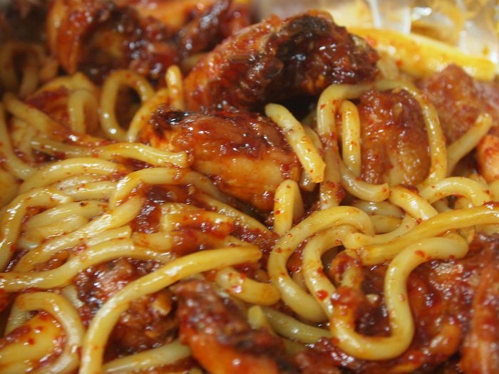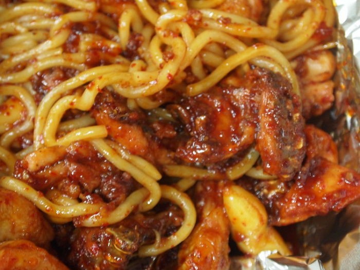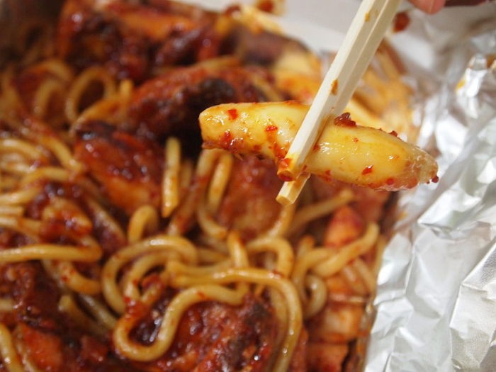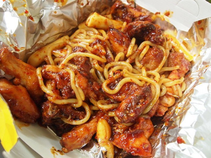 사진 속 음식은 빨간 치킨 양념과 면발이 버무려져 있어 다소 생소하다.
