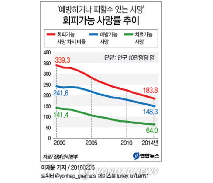 통계청의 2000년부터 2014년까지 사망원인통계 자료에 따르면 2014년 기준으로 사망자 26만7천650명 중 9만3천314명(34.9%)은 적절한 치료 및 예방으로 사망을 막을 수 있었다.