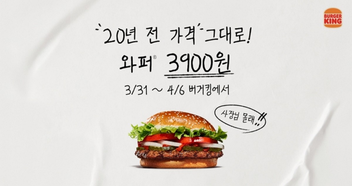 버거킹이 만우절을 맞아 시그니처 메뉴 '와퍼'를 20년 전 가격으로 즐길 수 있는 '사장님 출장 기념' 프로모션을 진행한다.