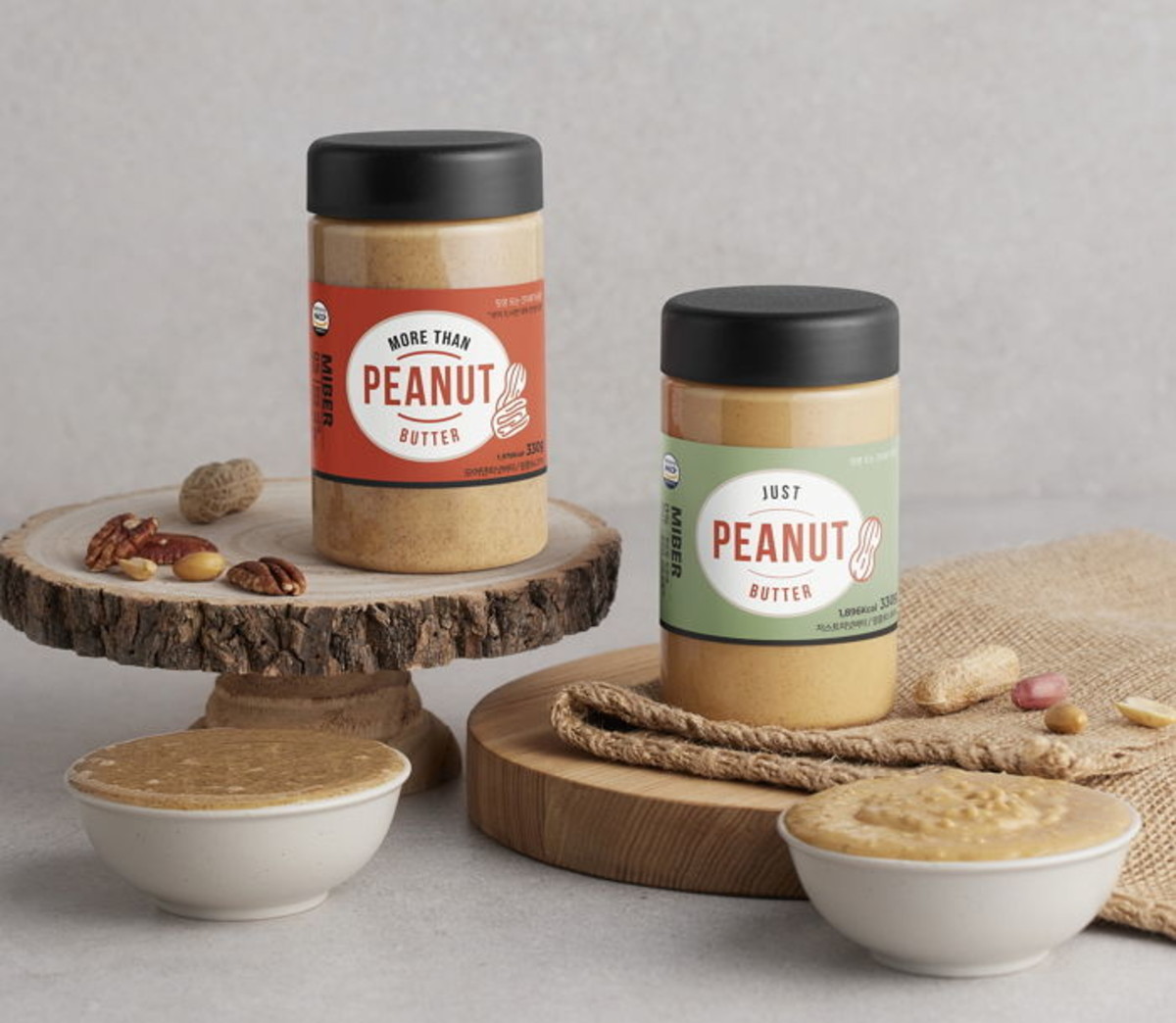 미베르의 메인 푸드 상품인 프리미엄 피넛버터 2종 '저스트 피넛버터'와 '모어댄 피넛버터'는 합성첨가물 없이 100% 순수한 식물성 원재료로 만들어졌다.