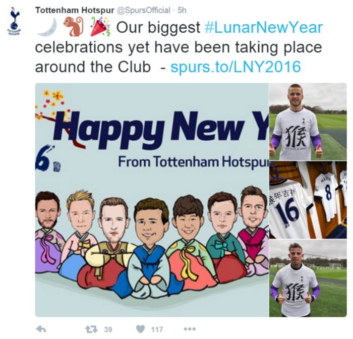 토트넘은 해당 사진을 게재하면서 달, 원숭이, 축하 팡파르 이모티콘과 함께 "지금까지 한번도 표현해본 적 없던 큰 마음을 담아 음력설을 축하드립니다(Our biggest Lunar New Year celebrations yet have been taking place around the club)"라는 내용의 글을 적었다.