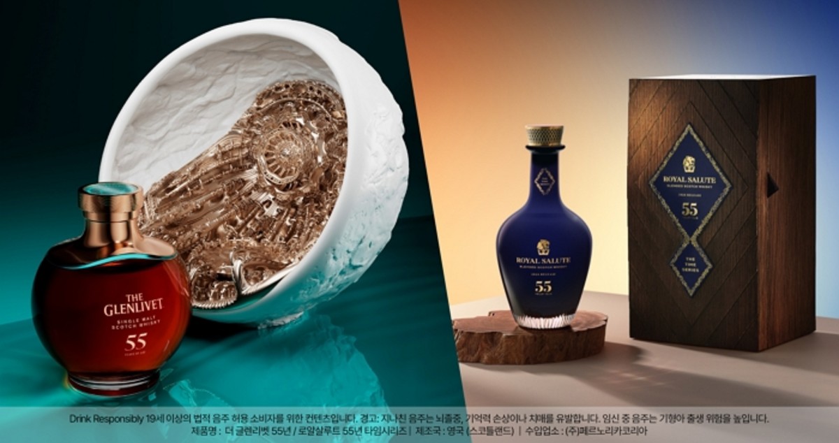 특히 마이클 한스마이어와의 협업으로 탄생한 '더 글렌리벳 55년'은 국내에 단 2점만 소개된다. 스코틀랜드 스페이사이드 리벳 강과 풍경에서 영감을 받아 탄생한 이 작품은 55년 이상 숙성된 황금빛 위스키 원액과 로즈골드 빛 기하학적 무늬의 조각품이 조화를 이루고 있다. 또한, 다팅턴의 수작업으로 완성된 크리스탈 보틀에 담긴 '로얄살루트 55년 타임 시리즈'는 오랜 숙성과 블렌딩 기술로 독보적 퀄리티를 자랑한다.