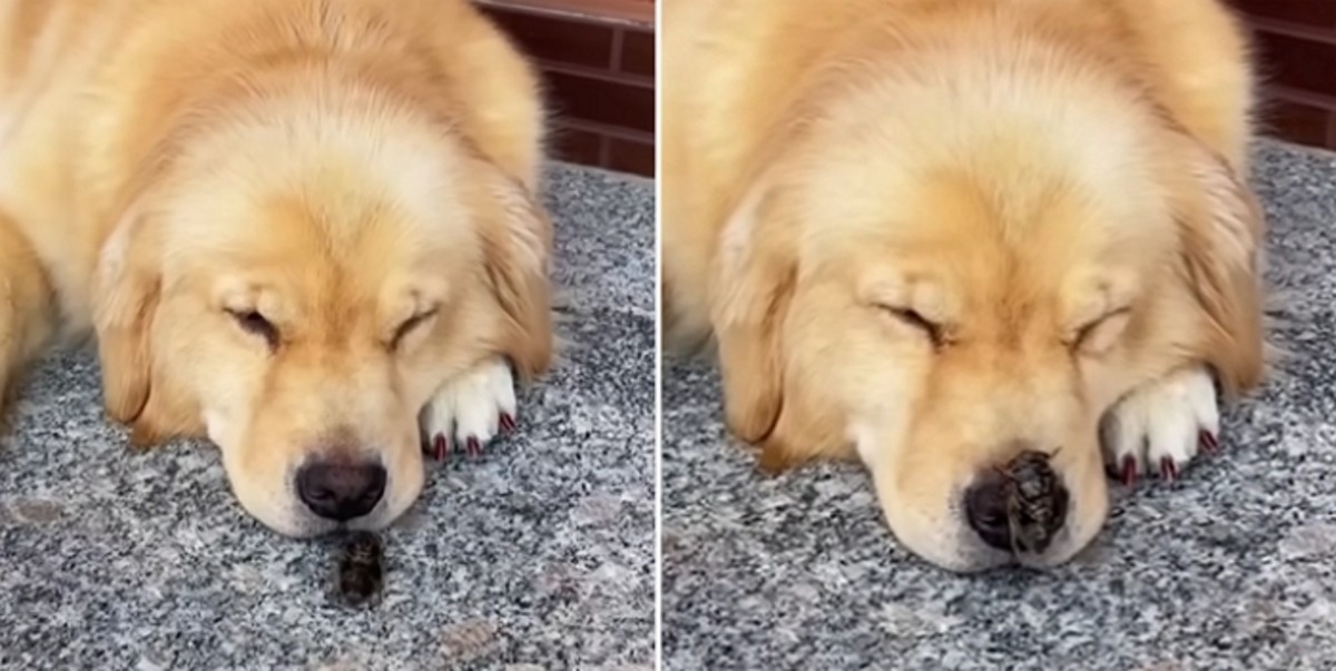 공개된 영상에 따르면 바닥에 누워 곤히 잠든 리트리버의 코 앞으로 작은 매미 한 마리가 다가오기 시작했다.