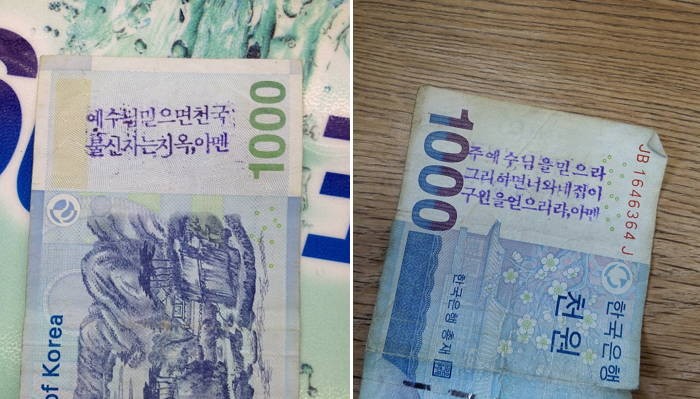 해당 글에 다른 누리꾼은 과거 한 종교단체에서 전도 도장을 찍은 천원 지폐 사진을 소개하며 무개념 행동이라고 꼬집기도 했다.