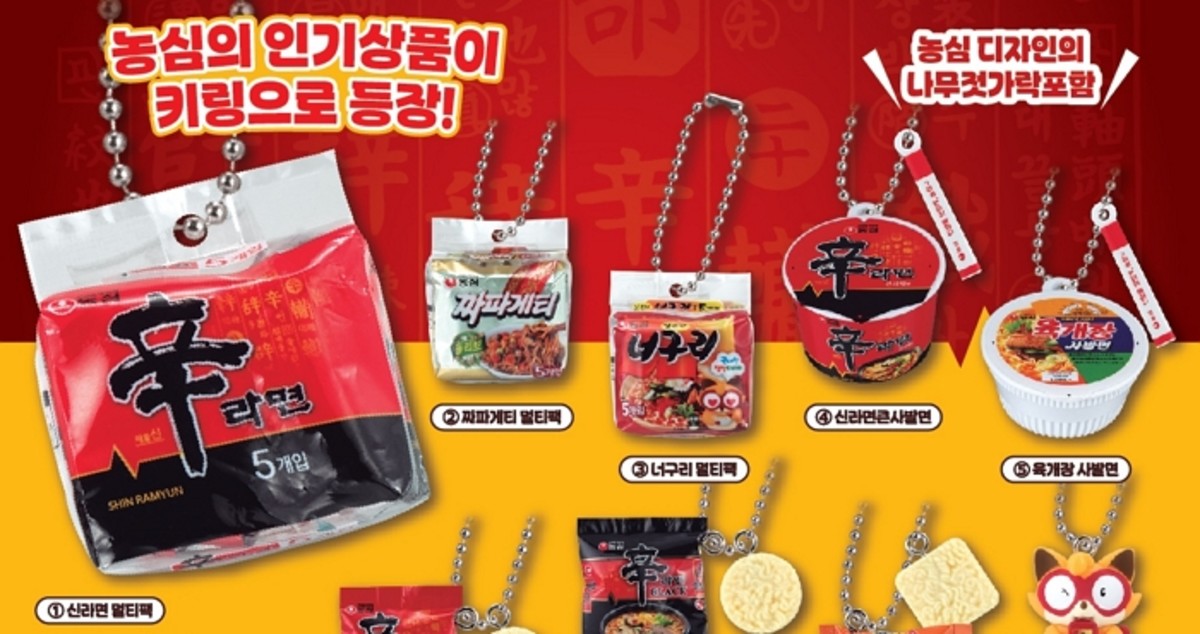 농심이 일본의 대표 완구회사 반다이와 손잡고 농심 라면의 한글 패키지 디자인을 그대로 구현한 키링을 글로벌 시장에 선보인다.