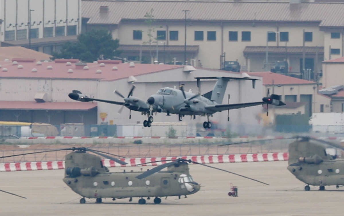 23일 경기 평택시 팽성읍 주한미군기지 캠프 험프리스에 정찰기 RC-12X 가드레일이 이륙하고 있는 모습. 2025.5.23/뉴스1