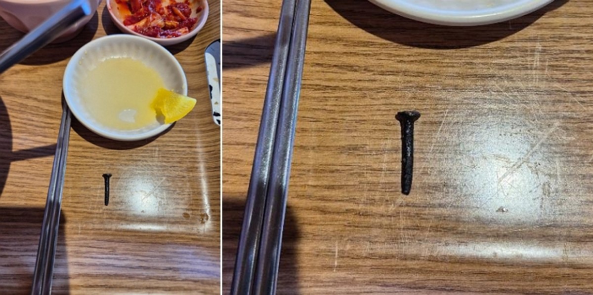 그는 "라면을 먹다가 길이 3cm가량의 녹슨 못이 나와서 어금니가 깨지는 어이없는 사고가 발생했다"고 말했다.