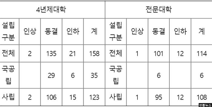 사립대 231곳 중에는 201개교가 동결을, 27개교가 인하했다. 인상을 결정한 3개 학교는 포스텍(포항공과대)과 중앙승가대, 조선간호대였다.