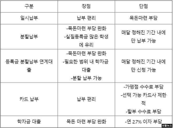 그럼에도 등록금 액수 자체가 큰 탓에 학부모와 학생의 부담은 여전하지만 학자금 대출과 분할 납부 등 자신의 상황에 맞춰 선택할 수 있는 각종 납부 제도를 잘 활용하면 그나마 부담을 덜 수 있다.