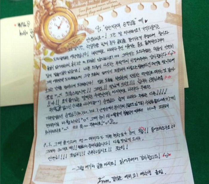 특히 별도로 마련한 수면안대 2개에 대해서는 '마지막으로 바래다줬던 경찰관 두 분에게 전해달라'면서 '그때 눈이 새빨갛게 충혈돼서 몹시 피곤해 보이던데 (수면안대를)쓰고 푹 주무세요'라며 애교 섞인 사연을 남겼다.