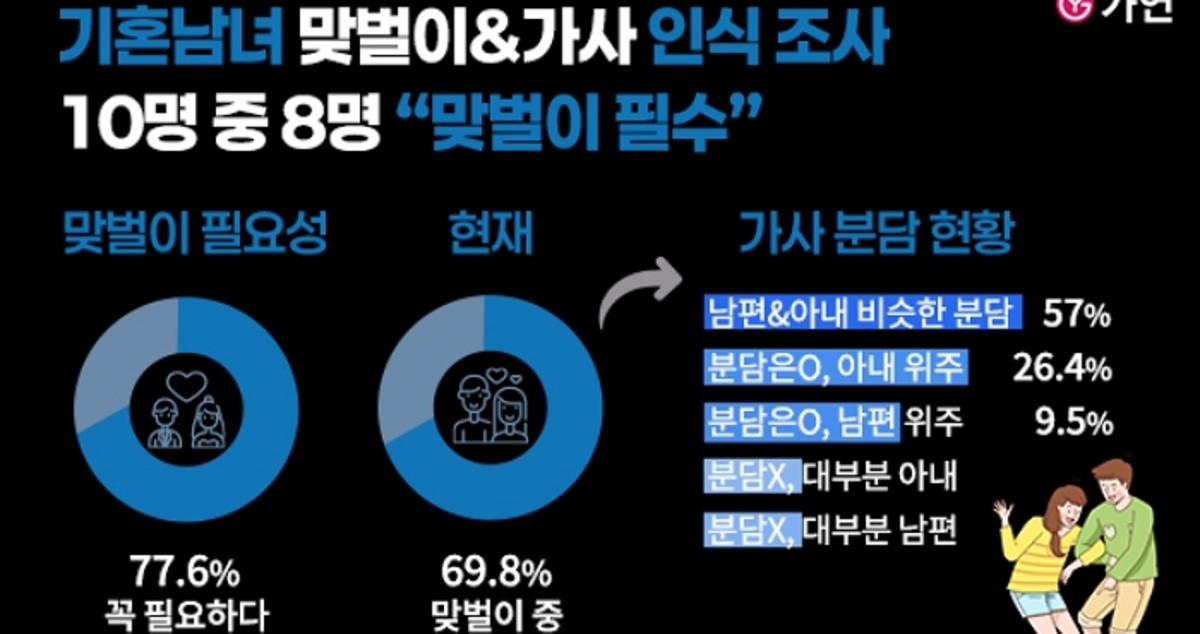 이는 가연이 지난 2022년 초 발표한 조사에서 맞벌이 중이라 답한 기혼자 비율이 60.8%였던 것과 비교하면 3년 새 9%가 증가한 수치다.