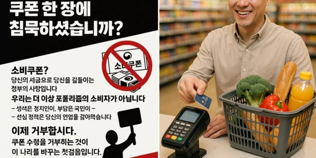 해당 이미지에는 '당신은 오늘도 쿠폰 한 장에 침묵하셨습니까?'라는 문구로 시작해 "소비 쿠폰은 당신의 세금으로 당신을 길들이는 정부의 사탕"이라는 주장이 담겨 있다.