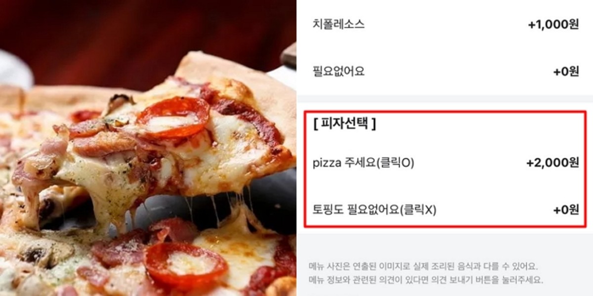 이 또한 비판이 이어지자 24일 오후 4시 기준 2,000원을 추가하는 'pizza 주세요(클릭O)' 옵션과 0원의 '토핑도 필요없어요(클릭X)' 옵션으로 다시 정정해 둔 것으로 확인된다.