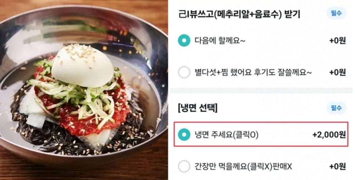 필수옵션으로 추가금을 강요한 피자집이 '강제 팁' 논란에 휩싸인 가운데, 같은 수법으로 추가금을 요구한 냉면집이 포착돼 누리꾼들의 뭇매를 맞고 있다.
