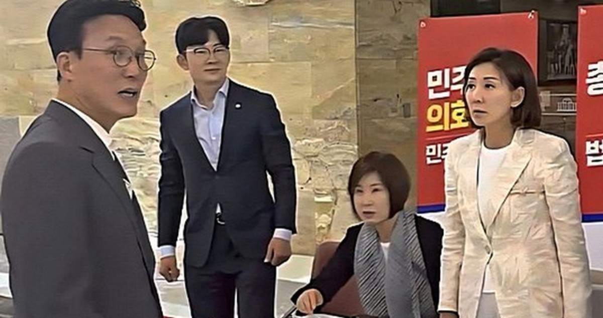 김민석 국무총리 후보자(맨 왼쪽)가 30일 오후 서울 여의도 국회 로텐더홀에서 농성 중인 나경원 국민의힘 의원(왼쪽 네 번째)과 대화를 나누고 있다. / 뉴스1(독자 제공)