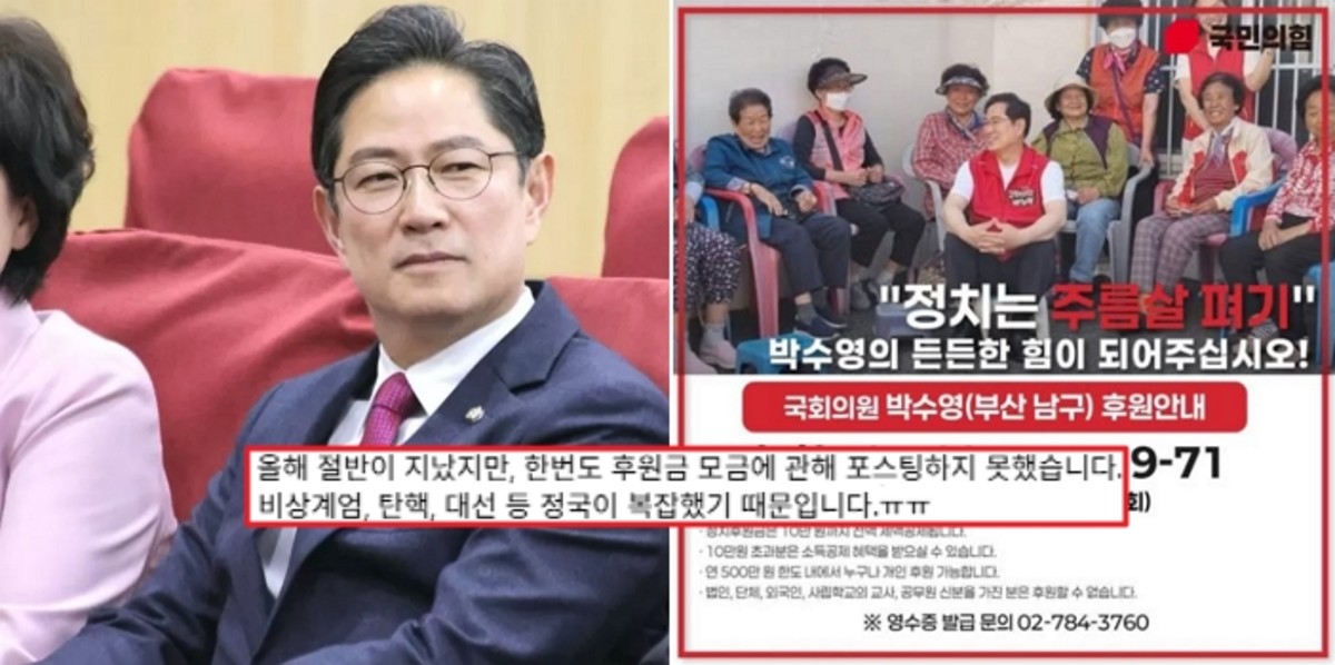 지난 3일 박 의원은 자신의 페이스북에 "올해 절반이 지났지만, 한번도 후원금 모금에 관해 포스팅하지 못했다. 비상계엄, 탄핵, 대선 등 정국이 복잡했기 때문이다. ㅠㅠ"라는 글을 올렸다.