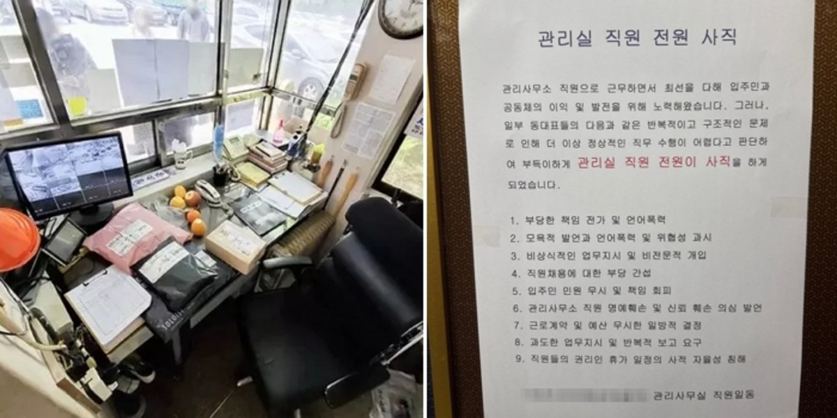공유된 게시물에 따르면 관리실 직원들은 "일부 동대표들의 반복적이고 구조적인 문제로 인해 더 이상 정상적인 직무 수행이 어렵다고 판단해 부득이하게 관리실 직원 전원이 사직하게 됐다"고 밝혔다.