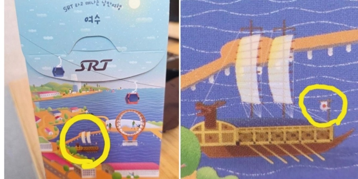 해당 게시물의 작성자는 SRT 특실에서 제공받은 간식 상자에 그려진 거북선의 선미에 일본 국기를 연상시키는 붉은 원 형태의 깃발이 달려있다고 지적했습니다.