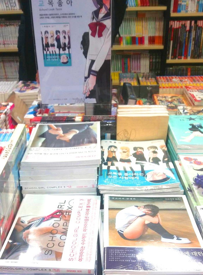 사진 속 서점 코너에는 여학생이 짧은 교복, 체육복 등을 입고 있는 사진을 모은 사진집과 다양한 학원물 만화책들이 자리잡고 있다.