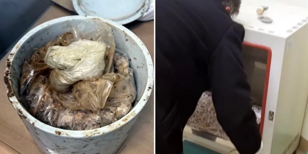 유골함에서 수습된 국가유공자의 유골을 실험실용 건조기를 통해서 건조하는 모습 / 국가보훈부노조