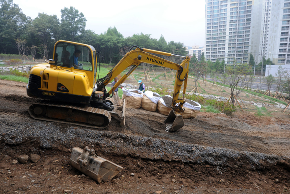 2012년 7월, 본격적인 여름 장마를 앞두고 서울 서초구 우면산에서 산림조압중앙회 관계자들이 포크레인 등을 이용해 장마철 비 피해를 예방하기 위해 배수로 작업을 하고 있는 모습 /뉴스1