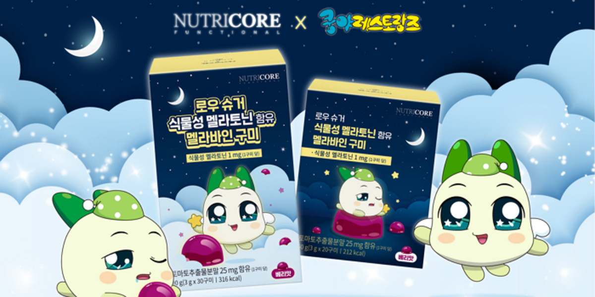 콜라보레이션을 통해 뉴트리코어의 '로우 슈거 식물성 멜라토닌 함유 멜라바인 구미 패키지'에 쿵야 레스토랑즈의 아트웍이 적용된 특별 패키지가 출시됩니다.