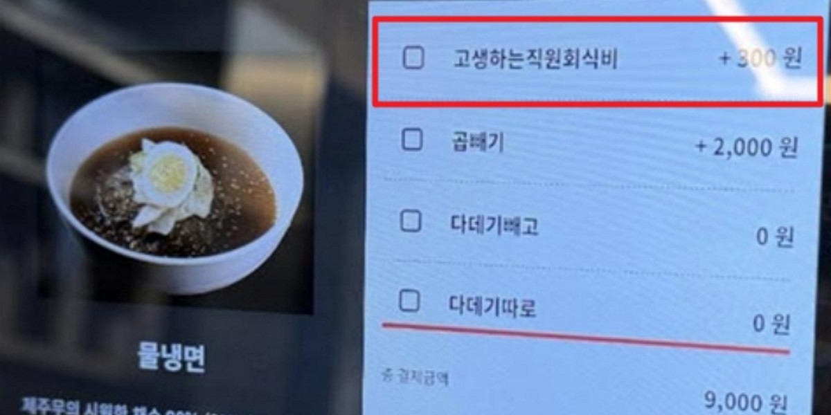 게시물 작성자가 공유한 사진에는 해당 냉면집의 키오스크 화면에 '고생하는 직원 회식비'라는 항목으로 300원을 추가 결제할 수 있는 옵션이 표시되어 있었습니다.