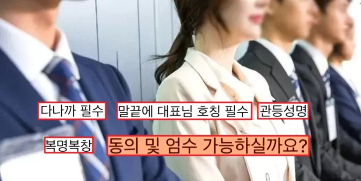 채용 담당자는 문자에서 "기본 FM 안내해 드린다. FM을 상당히 중요시하고 보수적으로 강조한다. 엄수해주셔야 한다"며 "다나까 필수. 말끝에 대표님 호칭 필수. 관등성명(언제 어디서든 본인 이름을 부르면 '네 대표님, OOO 사업부 매니저 OOO입니다. 말씀하십시오'라고 바로 나올 수 있어야 함) 필수. 복명복창(어떤 것을 요청하였을 때 단순히 '네 알겠습니다. 대표님'이 아니라 '네 알겠습니다. 뭐뭐 하겠습니다. 대표님' 등으로 답변) 필수입니다"라고 명시했습니다.