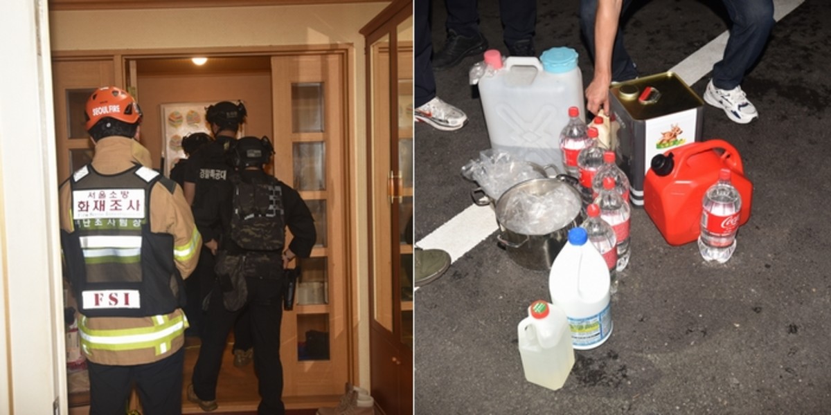 지난 21일 인천 송도국제도시 아파트에서 사제총기로 아들을 쏴 살해한 조 모 씨의 서울 도봉구 쌍문동 아파트에서 발견된 시너와 페트병 등 사제 폭발물들 / 서울소방재난본부