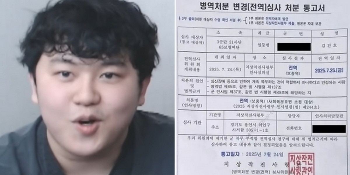 지난 27일 유튜버 김건호 씨는 "군대가 너무 힘들어서 런 해버렸습니다"라며 "정신적인 치료 후에 방송 키겠습니다. 마음껏 욕해주십시오"라는 글과 함께 24일 수령한 '병역처분 변경[전역]심사 처분 통고서'를 공유했습니다.