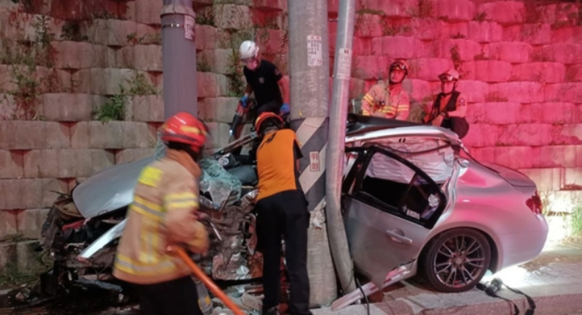 충돌 이후 인피니티 차량은 인도 방향으로 돌진하여 콘크리트 옹벽과 전봇대 사이에 끼이면서 멈춰 섰습니다.