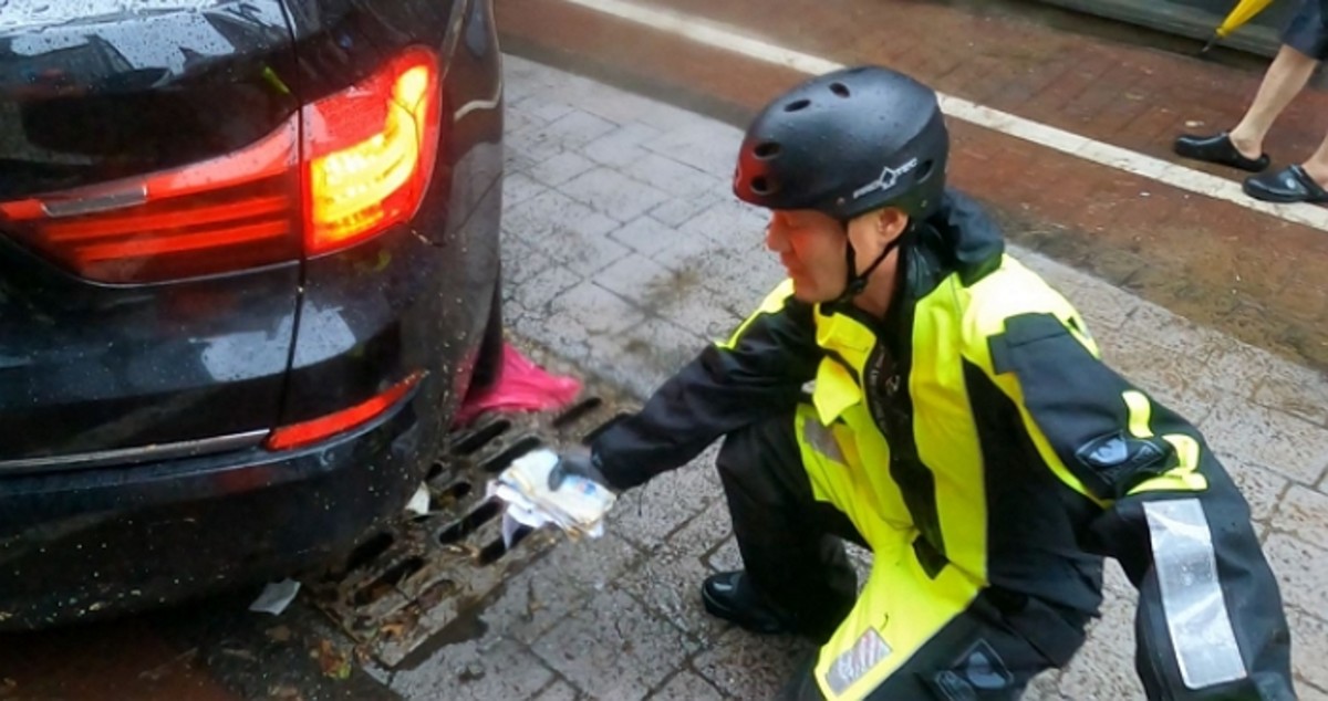지난 17일 낮 12시 30분쯤 광주 북구 중흥동 전남대 정문 도로에서 침수차량 배수작업하던 박선홍 소방위가 유실된 현금봉투를 발견한 모습. / 광주 북부소방 제공