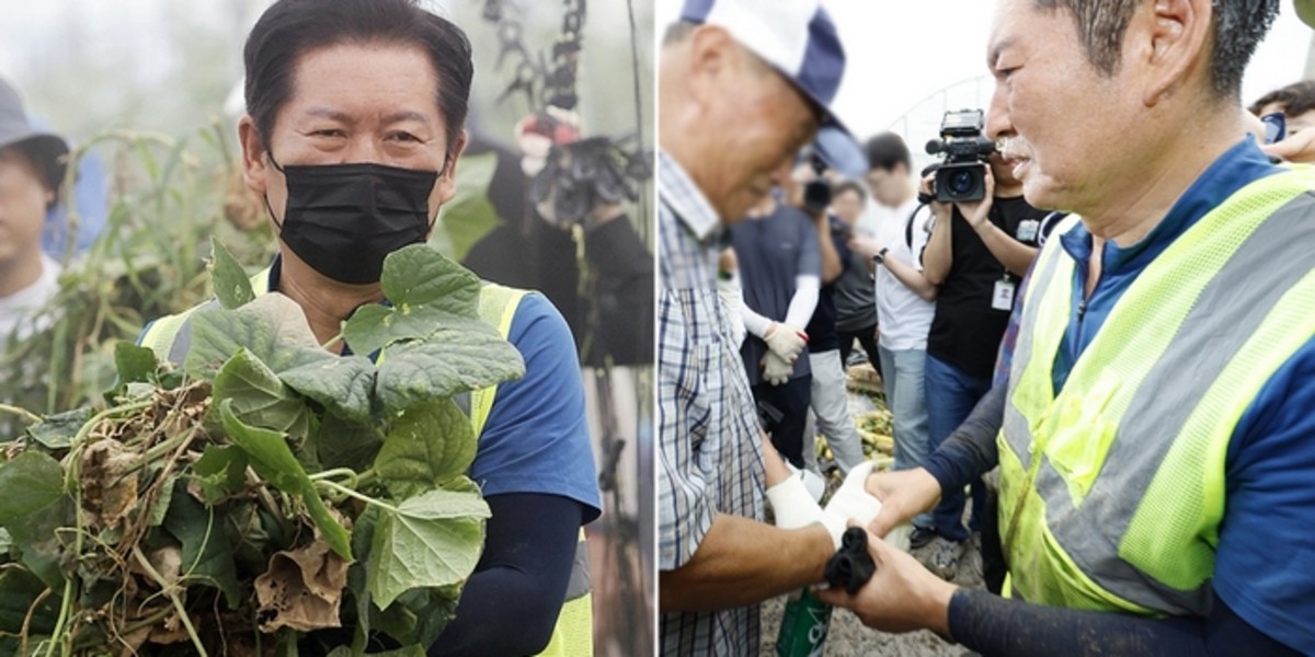 3일 정 대표는 집중호우로 피해를 입은 나주시 노안면의 오이 농장을 방문해 복구 작업에 직접 참여했는데요.