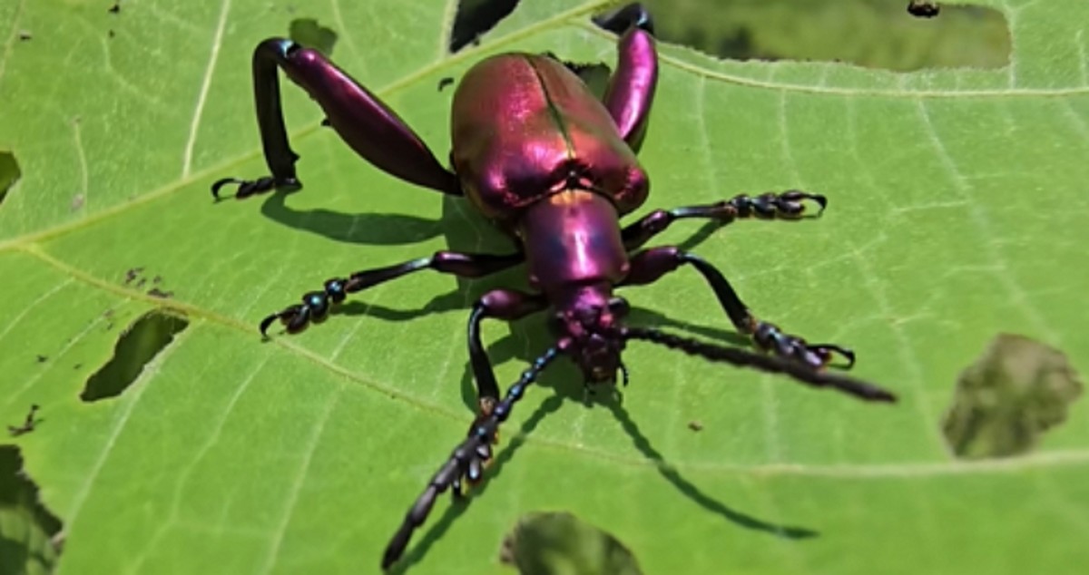 이 곤충은 핑크색 광택을 띠는 등껍질과 굵은 뒷다리가 특징적이어서 '열대의 보석곤충'이라는 별명을 가지고 있습니다.
