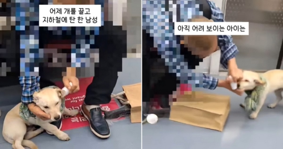 지하철 안에서 반려견의 몸에 물파스로 추정되는 물질을 바르는 남성의 모습이 포착돼 공분이 이어지고 있습니다.