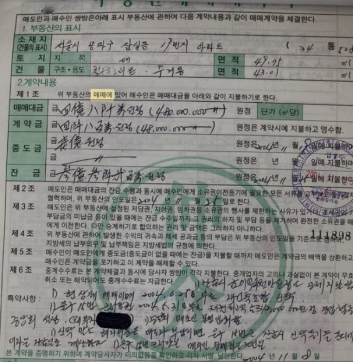 A씨가 공개한 매매계약서에 따르면, 그는 2004년 11월 전용면적 43㎡(13평) 규모의 잠실주공1단지 소형 아파트를 매입했습니다. 이 아파트는 이후 재건축 과정을 거쳐 2008년 5678가구 규모의 대단지 '잠실엘스'로 탈바꿈했습니다.