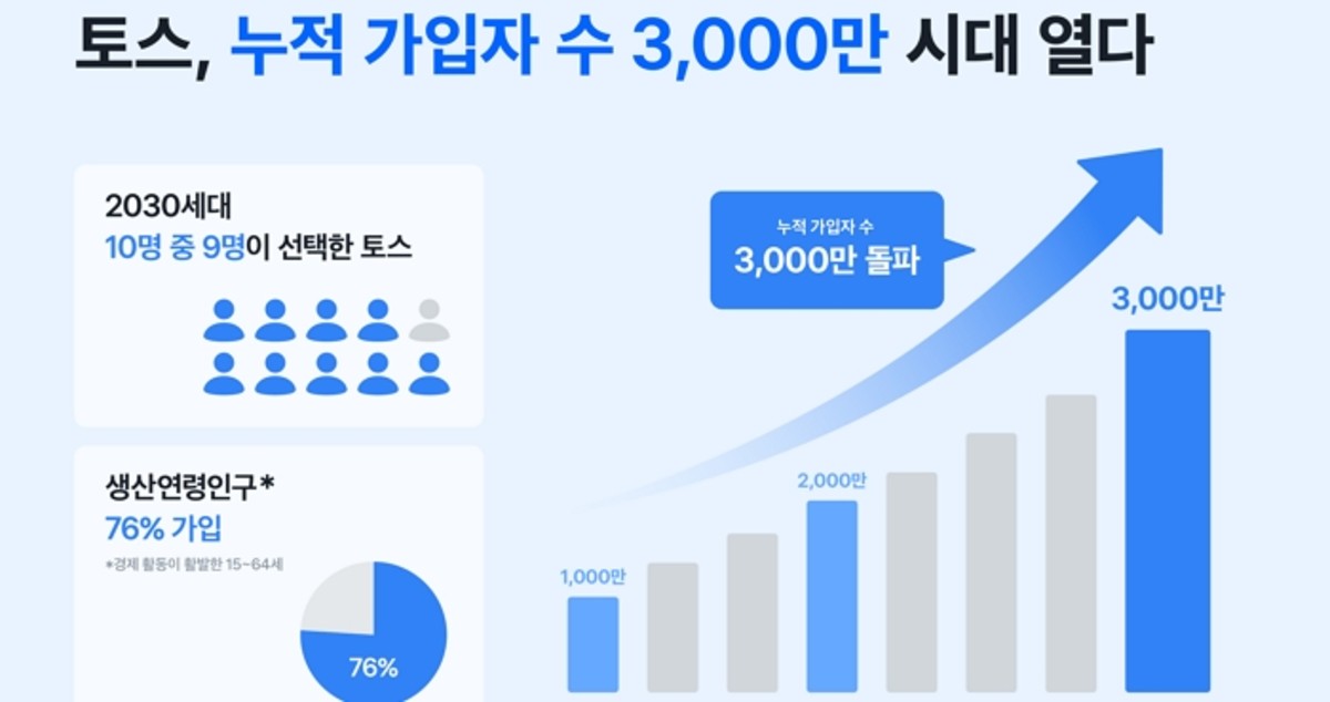 토스, 누적 가입자 3,000만 명 돌파... 2030세대 가입률 91% 넘어