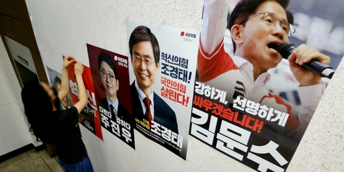 지난 6일 오전 대구 수성구 범어동 국민의힘 경북도당사 입구에 경북도당 당직자가 당 대표 후보 포스터를 부착하고 있다. / 뉴스1