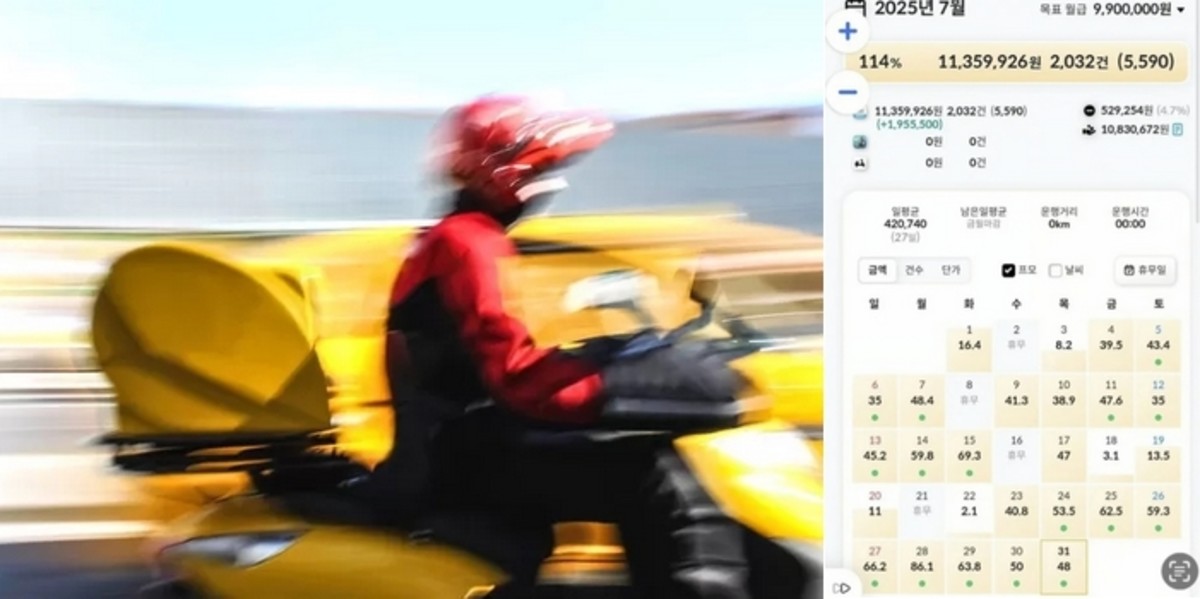 A씨가 인증한 '7월 월급' 내역에 따르면, 그는 지난달 배달료로만 1135만9926원을 벌어들였습니다. 이는 자신이 설정한 목표 월급 990만원을 크게 상회하는 금액입니다.