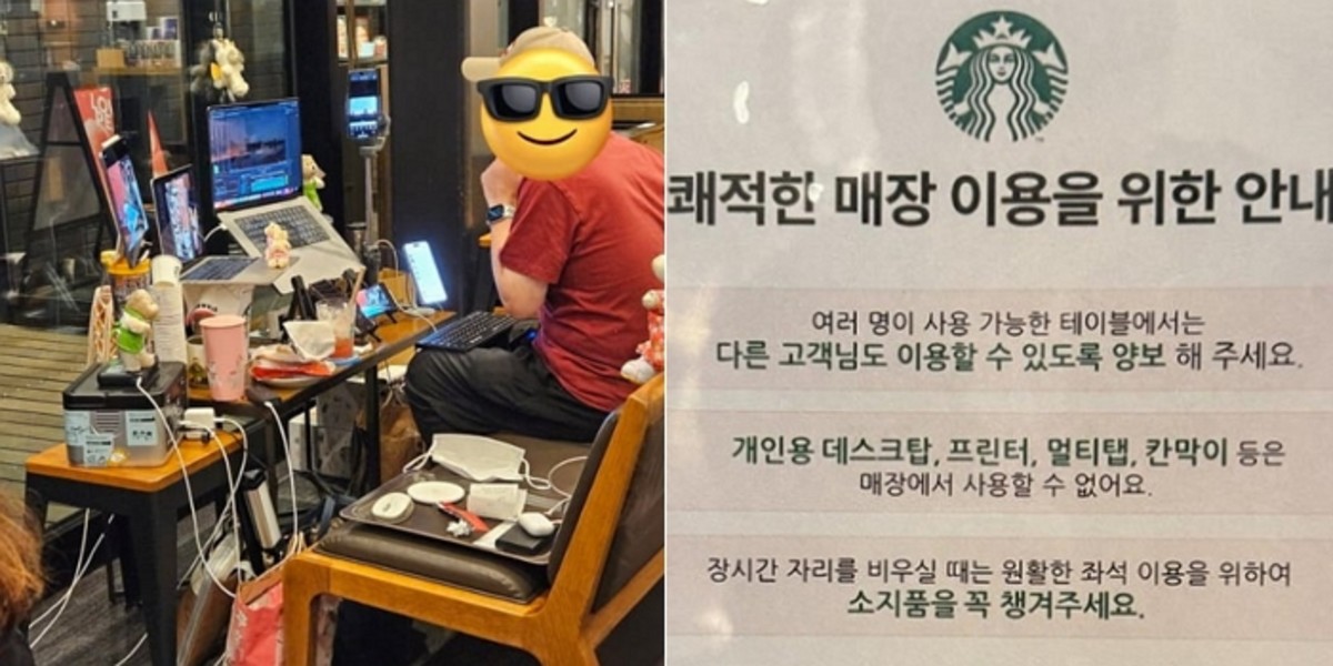 지난 6월에는 SNS에 "동네 스타벅스에 외출 빌런이 있다"는 제목의 게시물과 함께 스타벅스 매장 테이블에 칸막이를 설치하고 헤드셋, 키보드, 마우스, 태블릿 등 각종 장비를 설치해 둔 모습이 담긴 사진이 공개되기도 했습니다.