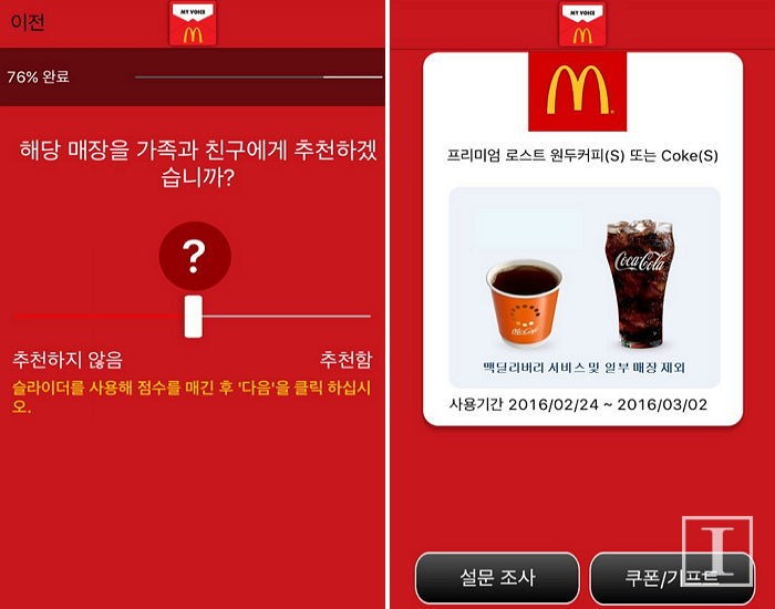 그 뒤 나오는 매장에서 서비스받은 시각과 만족도 그리고 해당 매장을 가족과 친구에게 추천하겠느냐는 등의 질문에 대답하면 쿠폰이 지급된다.