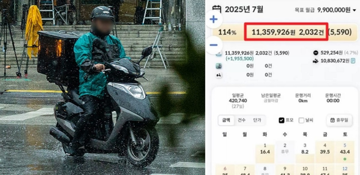 서울 강남권에서 활동한 한 배달원이 7월 한 달간 벌어들인 실급여가 1000만 원을 넘어섰다는 게시물이 SNS에 올라 화제가 되고 있습니다.