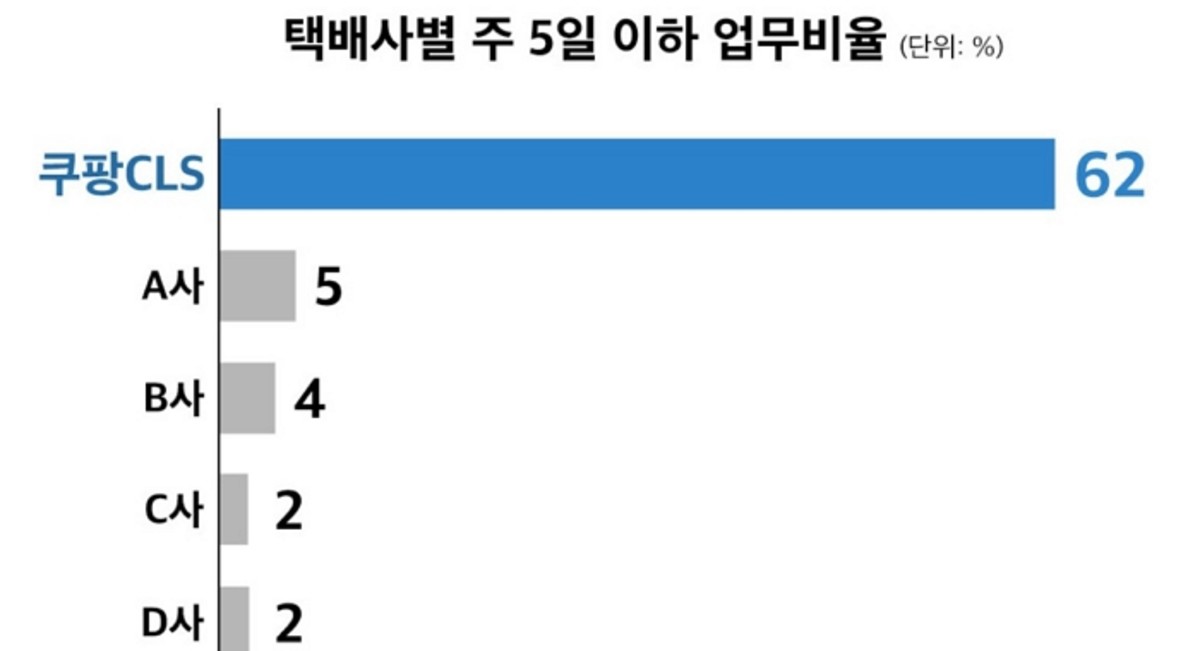 한국물류과학기술학회의 최근 조사에 따르면, CLS 위탁배송업체 택배기사 중 주 5일 이하로 배송한다고 응답한 비율이 62%에 달했습니다. 이는 타사의 1~5%에 비해 압도적으로 높은 수치입니다.