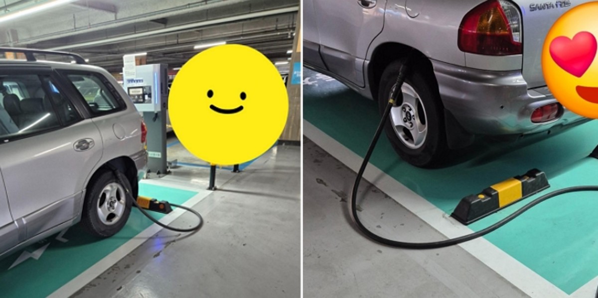 바로 해당 차량 바퀴에 '전기차 충전기'가 살포시 놓여있었다는 사실입니다.