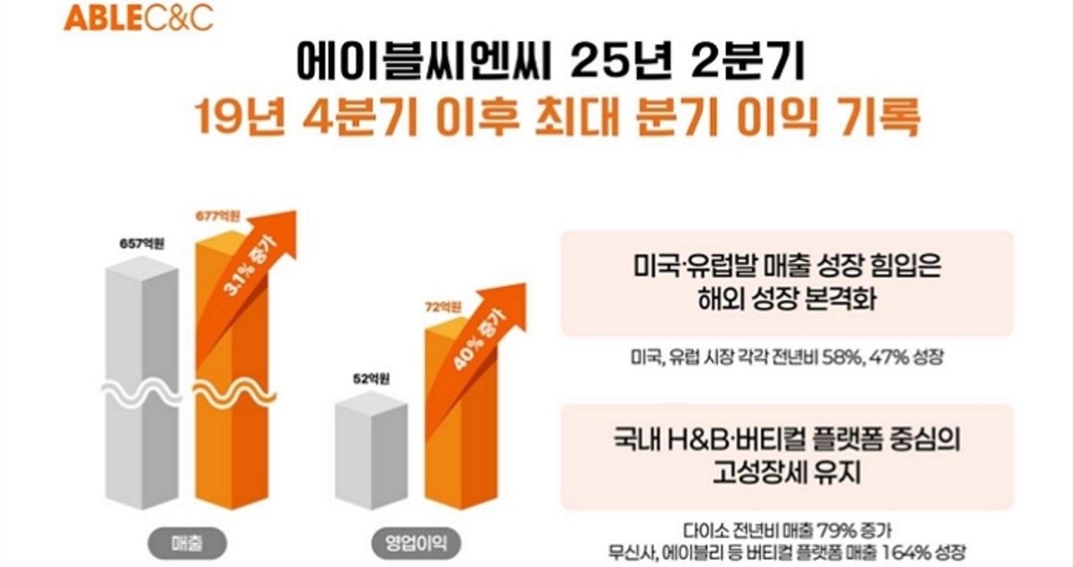 에이블씨엔씨가 2025년 2분기 연결기준 매출 677억 원, 영업이익 72억 원을 기록했다고 지난 13일 공시를 통해 발표했습니다.
