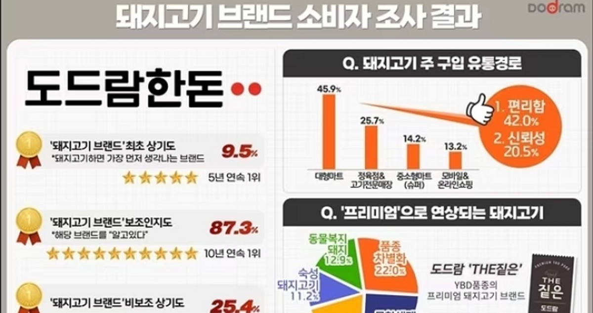 이 분석에서 '도드람한돈'은 돼지고기 최선호 브랜드, 보조인지도, 주구입 브랜드에서 10년 연속 1위를 기록하는 놀라운 성과를 보여주었습니다. 최초 상기도 역시 9.5%로, 소비자들이 돼지고기 브랜드 중 가장 먼저 떠올리는 브랜드로 확고히 자리매김했습니다.