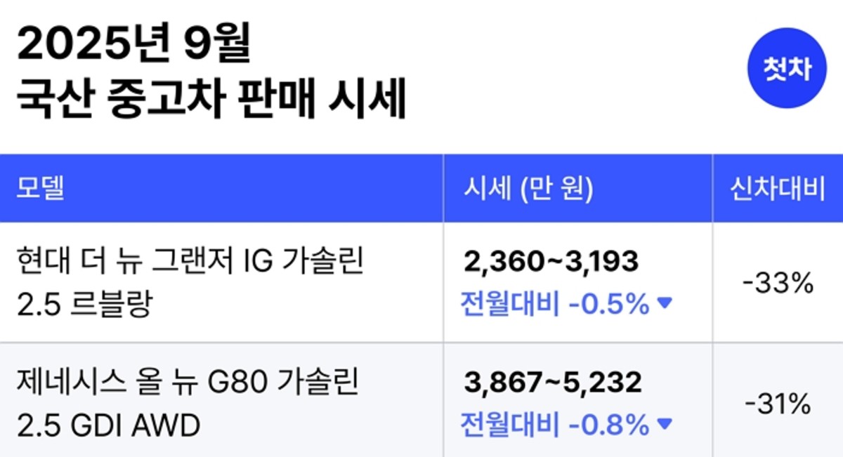 중고차 플랫폼 '첫차'가 2025년 9월 국산 및 수입 인기 중고차 모델 20종의 시세 전망을 발표했습니다.