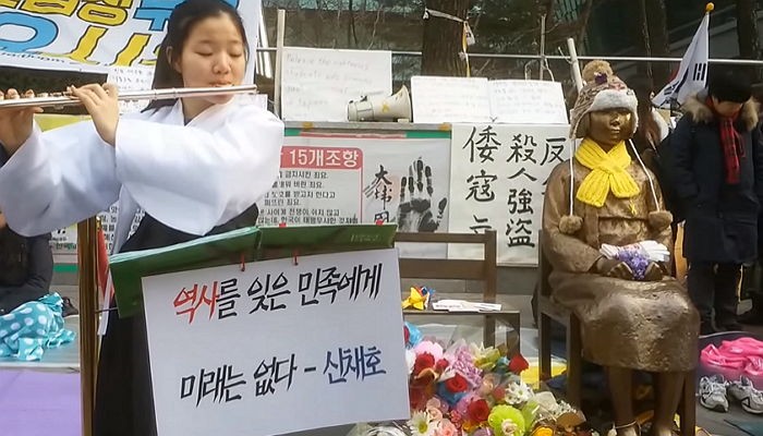 이 소녀는 일본 위안부 피해자 할머니의 이야기를 바탕으로 만들어진 영화 '귀향'이 상영되는 영화관에서 우리나라 전통 가요 '아리랑'을 연주했다.